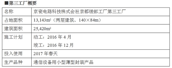 京瓷株式會社的全資子公司京瓷電路科技株式會社將在京都綾部工廠用地內建三工廠。京瓷電路科技株式會社主要生產服務器、網絡設備用高密度布線基板(封裝)及大型印刷電路板(主板)。