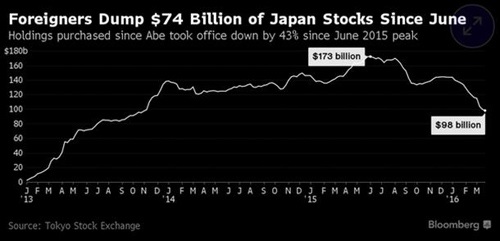 出于對(duì)安倍經(jīng)濟(jì)學(xué)以及日本經(jīng)濟(jì)前景的悲觀態(tài)度,彭博數(shù)據(jù)顯示,今年來(lái)交易員撤走了460億美元的資金,投資者已經(jīng)連續(xù)十三周拋售日本股票,創(chuàng)1998年以來(lái)長(zhǎng)連跌紀(jì)錄。東證指數(shù)下跌17%,這一表現(xiàn)之差僅次于意大利。