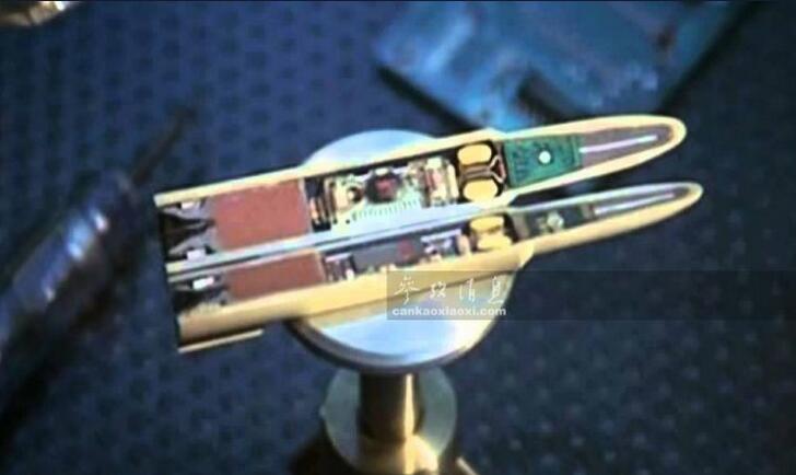圖為“精確制導子彈”的實際剖面截圖,可見與傳統子彈的結構截然不同,可見微型彈道計算機和傳感器。
