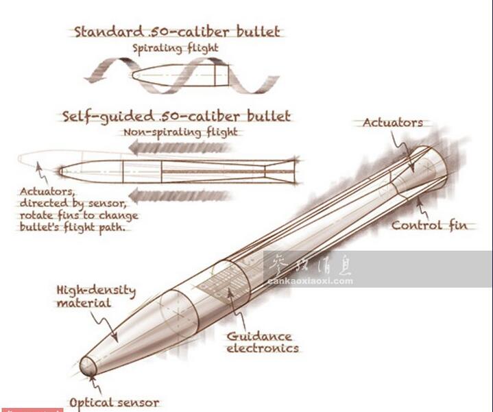 狙擊手在使用制導子彈時,只要鎖定目標,不論朝哪個方向射擊,子彈后都能通過自主修正彈道命中目標。這張手繪圖展示了制導子彈和傳統子彈之間的顯著區別,傳統子彈需要靠自旋穩定彈道(上),制導子彈(下)無需自旋,直接靠尾部的彈翼就可改變飛行彈道。有人吐槽稱,配備這種子彈后,人人都能成為神槍手,或許狙擊手的時代就此結束了。吐槽歸吐槽,制導子彈的實戰效果仍需拭目以待。