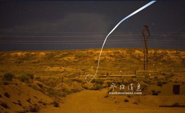 制導子彈的傳動系統包括一個驅動電機和一個形似魚鰭的微型可控彈尾。驅動電機可為傳統系統提供動力,微型尾翼可不斷調整彈道,使子彈以曲線彈道擊中目標(即使目標躲在墻后也可打中)。圖為美軍在桑迪亞家試驗室進行制導子彈試射時的延遲攝影圖,圖中看到的彈道實際是制導子彈尾部的LED指示燈留下的,可以清晰看到其在飛行中可多次改變彈道直至命中目標。
