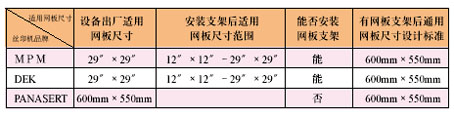 全球范圍內,絲網印刷機品牌和型號較多,其中主流品牌主要有“MPM”、“DEK”、“PANASERT”等,所有這些品牌的印刷機都需使用到絲網板(鋼模板)Stencil,以上三種主流品牌印刷機對Stencil尺寸要求如下表: