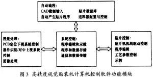 3)軟件功能高精度視覺貼片機(jī)軟件系統(tǒng)一般為二級(jí)計(jì)算機(jī)控制系統(tǒng),采用 DOS或Windows界面,也有采用UNIX操作系統(tǒng)的。主要由系統(tǒng)控制軟件、自動(dòng)編程軟件、貼片控制軟件和視覺處理軟件等幾部分組成。其主要組成功能模塊如圖3所示。
