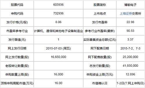 博敏電子此次發(fā)行總數(shù)為4185萬(wàn)股,網(wǎng)上發(fā)行1665萬(wàn)股,發(fā)行市盈率22.98倍,申購(gòu)代碼:732936,申購(gòu)價(jià)格:8.06元,單一帳戶申購(gòu)上限16000股,申購(gòu)數(shù)量1000股整數(shù)倍。
