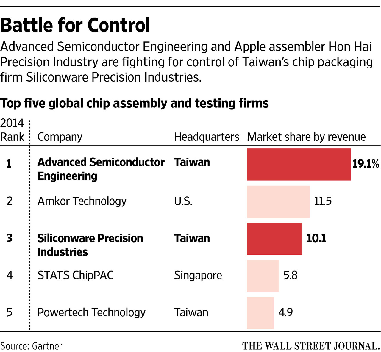 臺灣的日月光半導體制造股份有限公司(Advanced Semiconductor Engineering,以下簡稱“日月光半導體”)在今年8月份宣布,將在一項價值10億美元的交易中,收購規模更小的本土競爭對手——矽品精密工業股份有限公司(Siliconware Precision Industries,以下簡稱“矽品精密”)的25%股份。