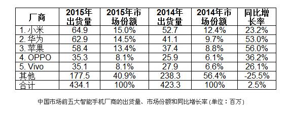 雖然際數據公司的數據顯示,中智能手機四季度的出貨量增加8%,至1.173億部;但Strategy Analytics上個月的報告指出,2015年四季度,中智能手機市場總量下降4%。這兩家研究機構均表示,與2014年相比,2015年智能手機出貨量增長3%(至4.34-4.38億部)。